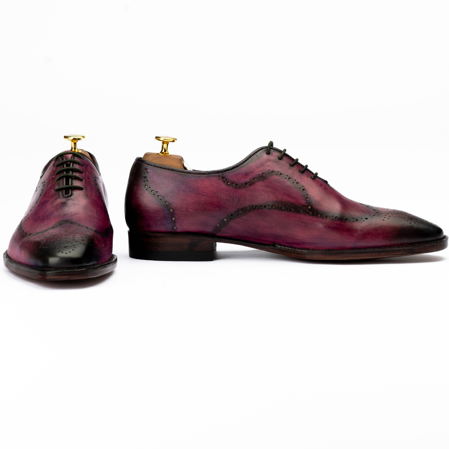The Dallen is a bold, handcrafted wingtip Oxford made from hand-painted purple patina calf leather with green laces, full brogue detailing, Goodyear welted sole, and a timeless almond toe. A true work of wearable art.