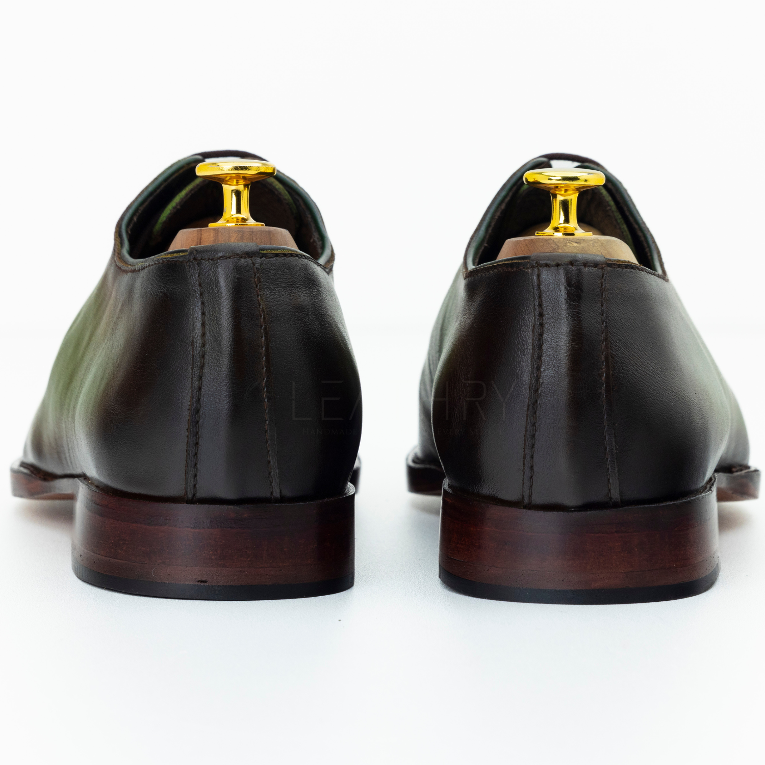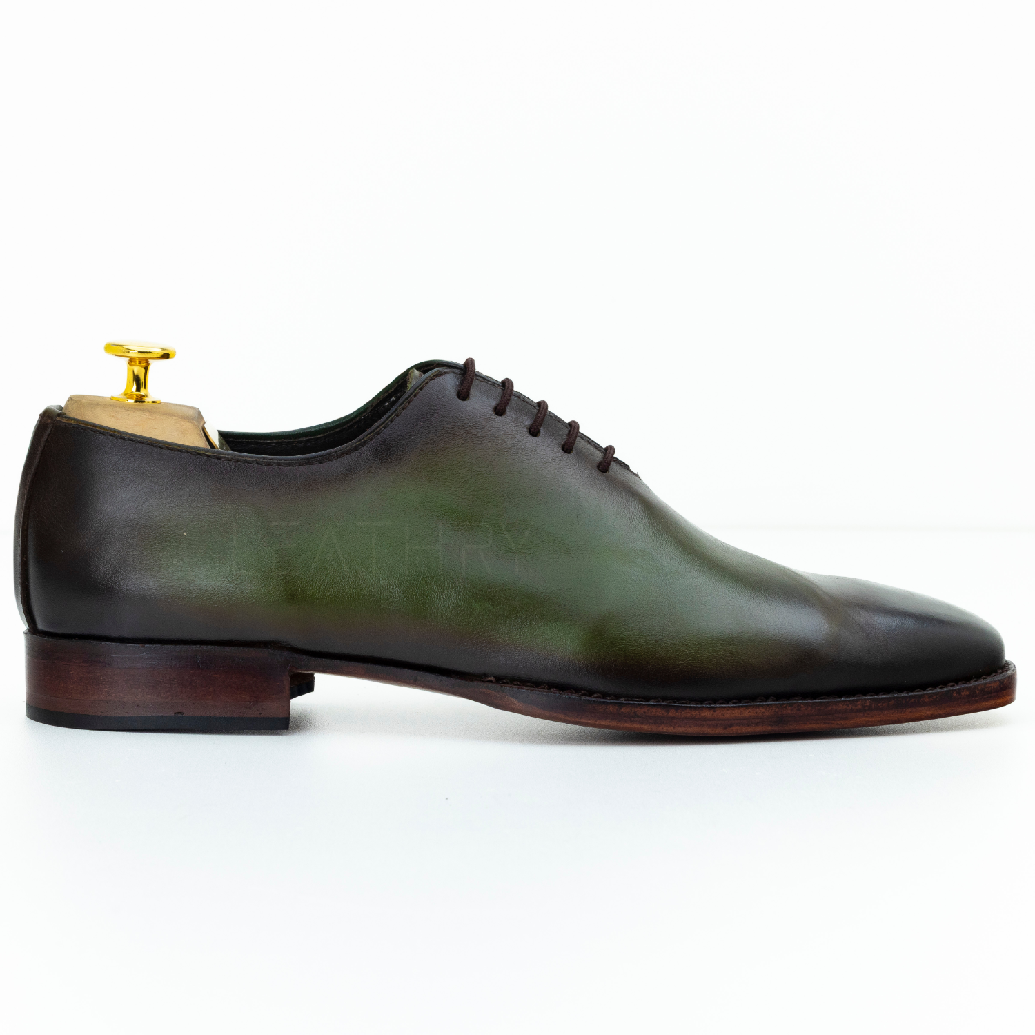 The Ewan is a wholecut Oxford crafted from hand-painted green and Bordeaux patina calf leather. Goodyear welted, double leather sole, almond toe—tailored for elegant confidence.