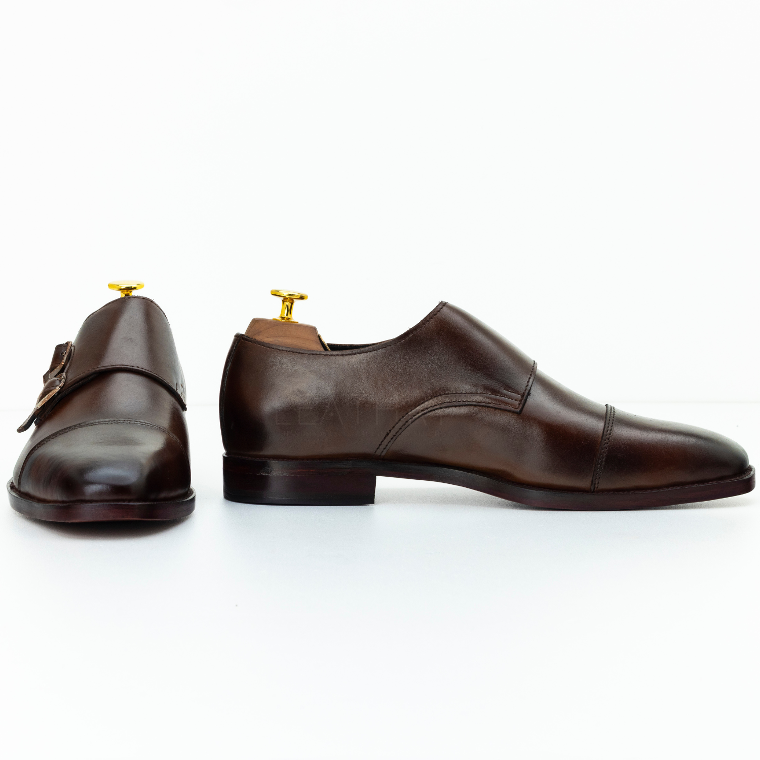 Product Name: The Florent | Dark Brown Double MonkMaterial: 100% Genuine Calf LeatherColor: Dark Brown BurnishedToe Type: Square ToeClosure: Double Monk StrapSole: Goodyear Welted Leather SoleHeel: Leather & Wood Stacked HeelLining & Insole: 100% Soft Calf LeatherStyle: Double buckle with straight cap toeHandmade: Yes, by skilled artisans