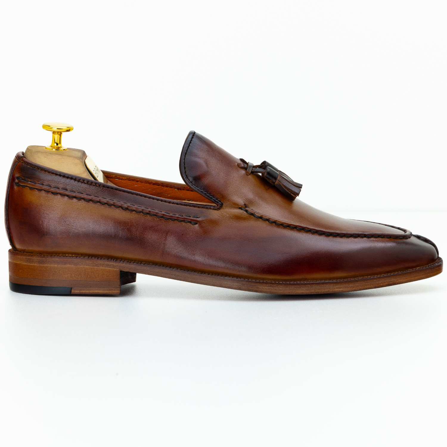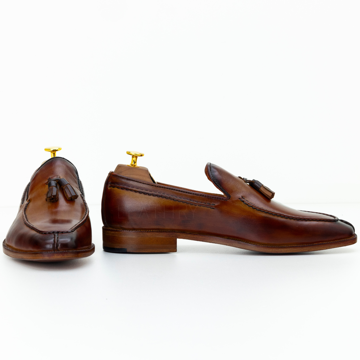 The Latham Hand Painted Tassel Loafer is handcrafted from 100% full-grain calf leather sourced from Italy, featuring a hand-painted camel and brown tan patina with tassel accents and a soft round toe. With a slip-on design, Goodyear welted leather sole, and leather-and-wood stacked heel, it offers sophisticated style and lasting comfort. Perfect for formal or casual wear, this loafer exudes versatile luxury.