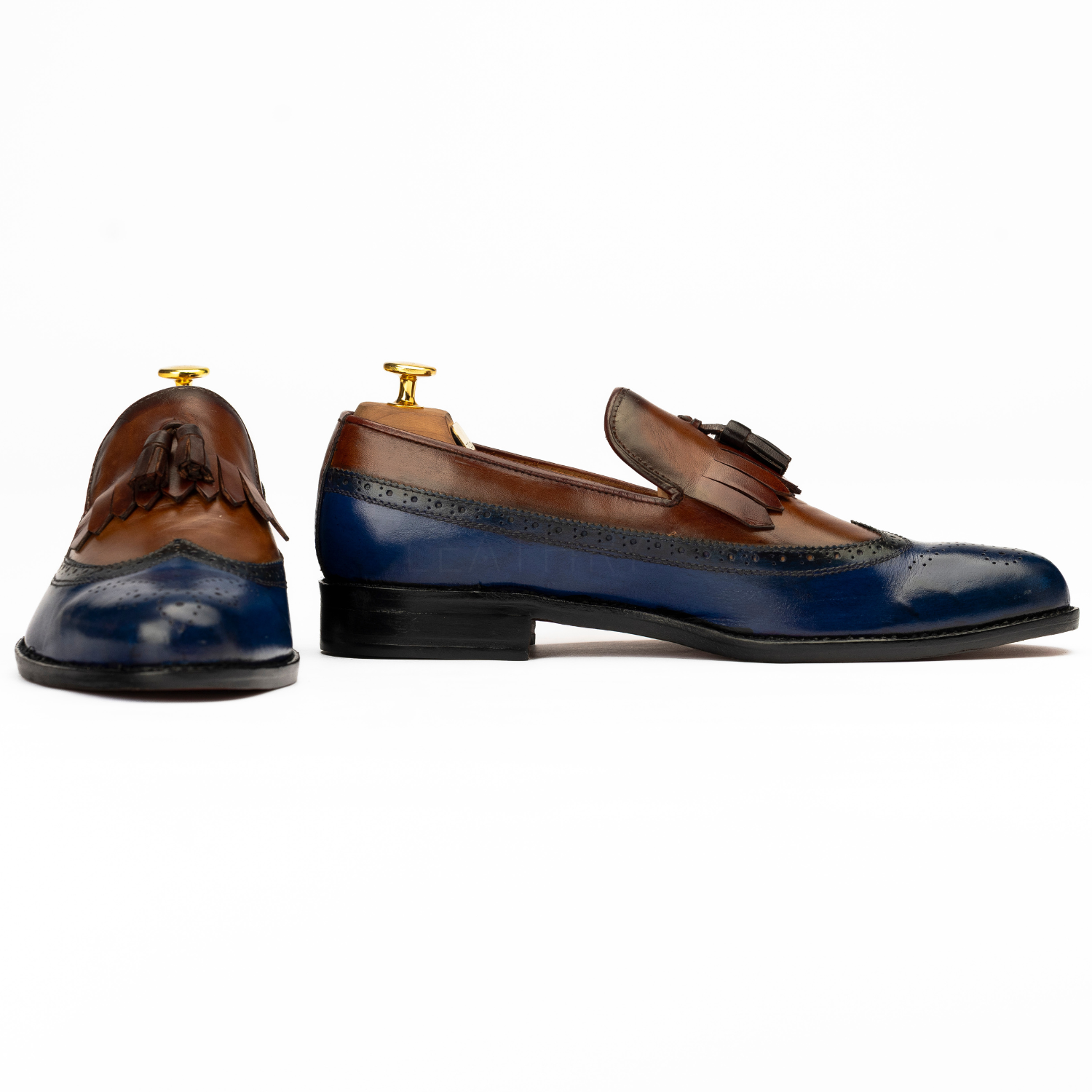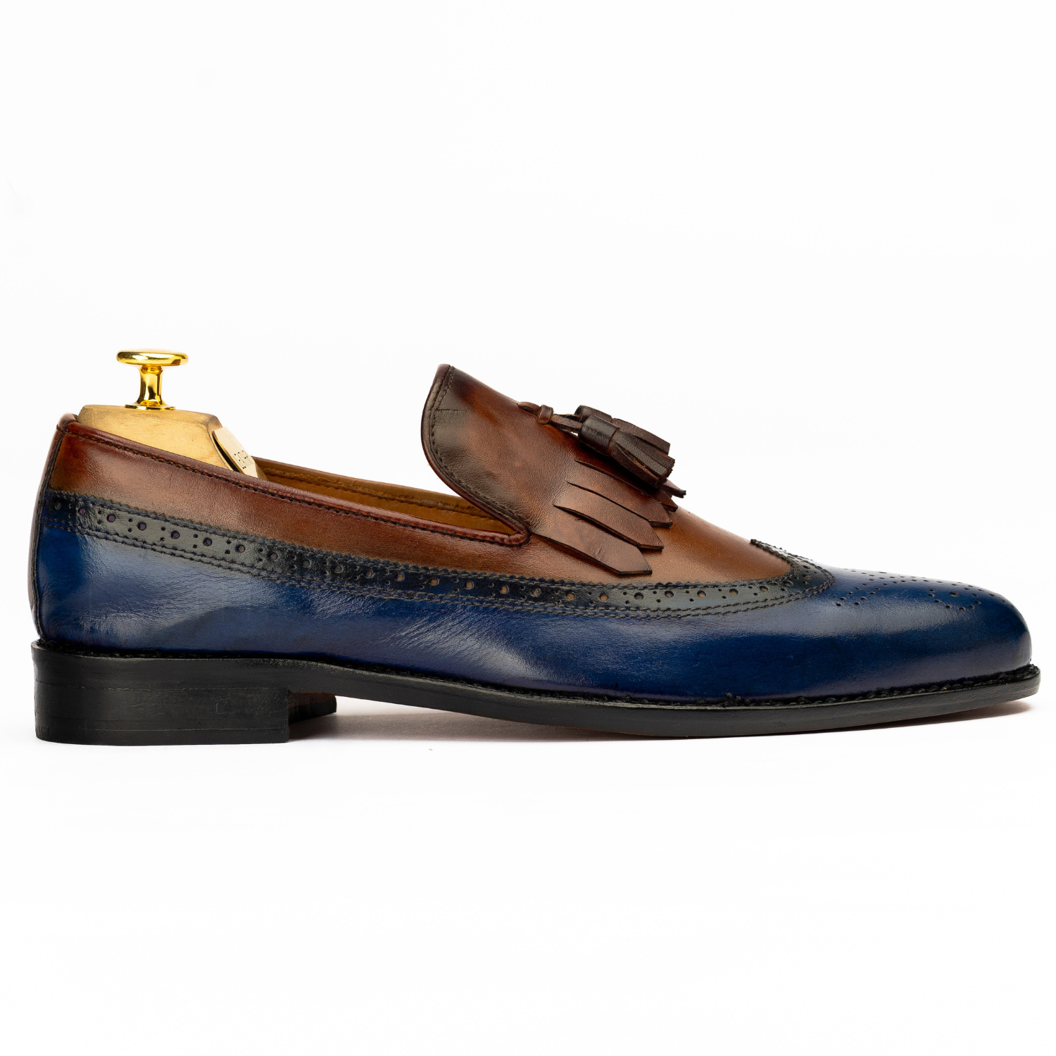The Norwin Two Toned Brogue Loafer is handcrafted from 100% full-grain calfskin leather sourced from Italy, featuring a hand-painted navy and tobacco upper with kiltie wingtip tassel accents and a round toe. With a slip-on design, antiqued double Goodyear welted leather sole, and leather-and-wood stacked heel, it offers timeless style and lasting comfort. Perfect for formal or casual wear, this loafer exudes versatile luxury.