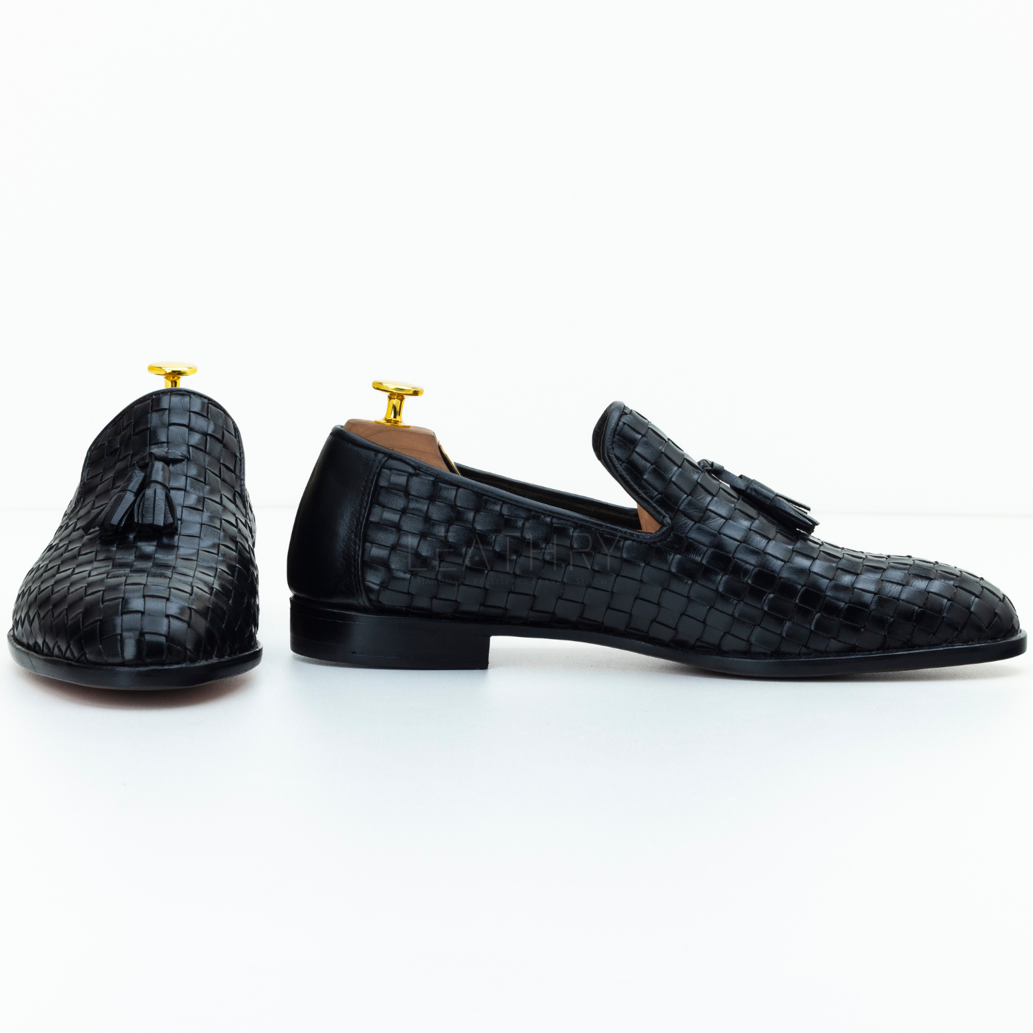 The Merritt Woven Leather Loafer is handcrafted from 100% full-grain calf leather sourced from Italy, featuring a black woven upper with tassel accents and an almond toe. With a slip-on design, Goodyear welted leather sole, and leather-and-wood stacked heel, it offers refined style and lasting comfort. Perfect for formal or casual wear, this loafer exudes versatile luxury.