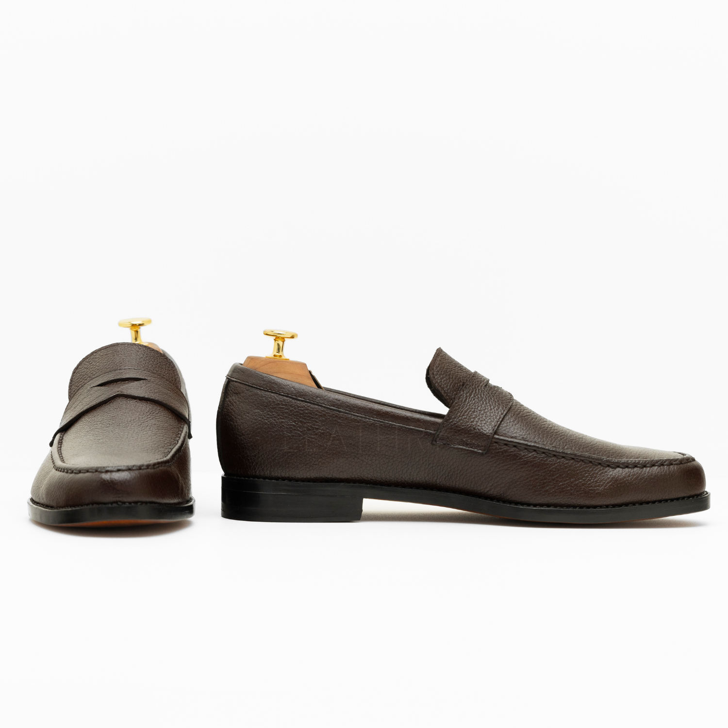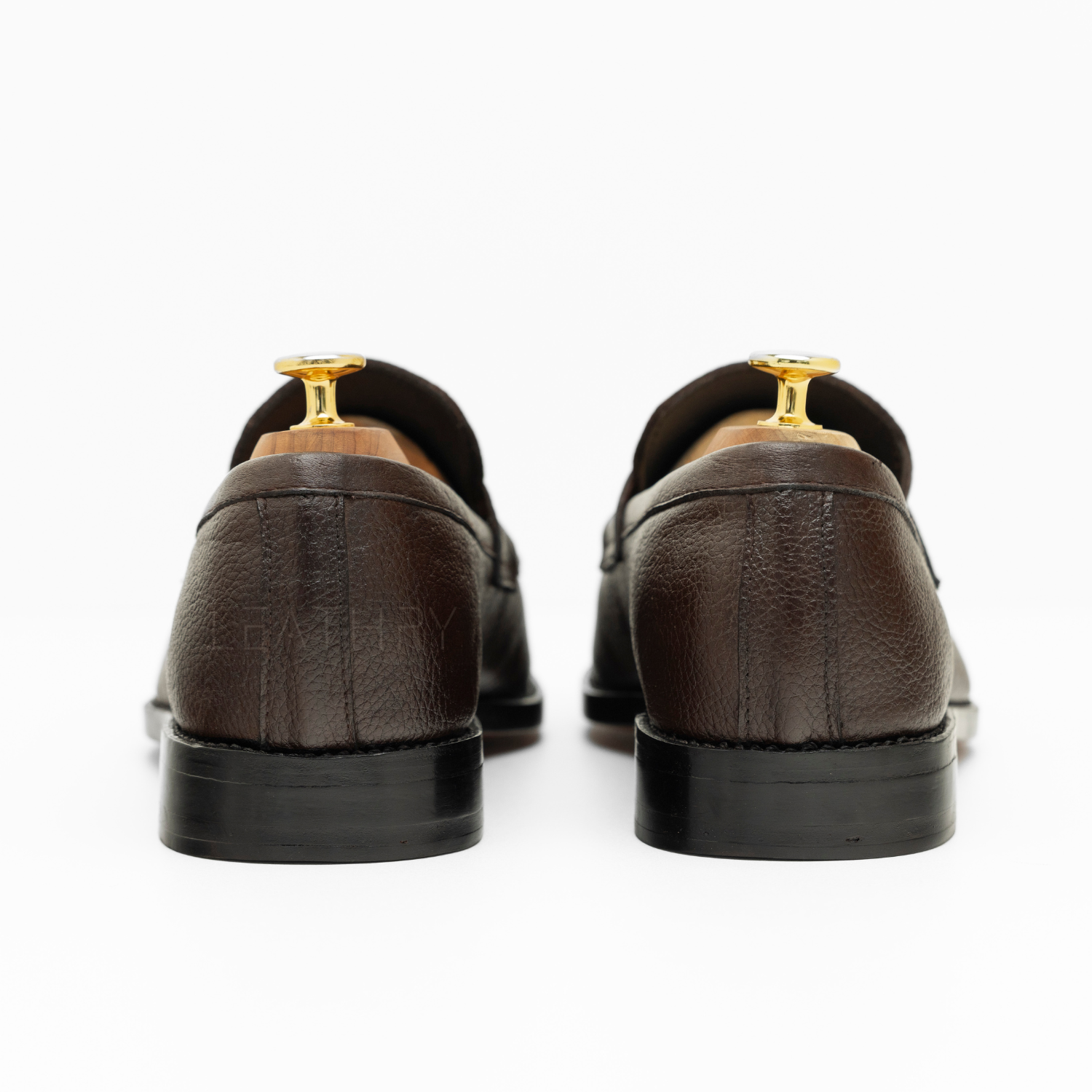 The Osric Pebbled Leather Loafer is handcrafted from 100% full-grain country calf leather sourced from Italy, featuring a dark brown pebbled finish with a ‘high walled’ round toe and penny strap. With a slip-on design, Goodyear welted leather sole, and leather-and-wood stacked heel, it offers timeless style and lasting comfort. Perfect for formal or casual wear, this loafer exudes versatile luxury.