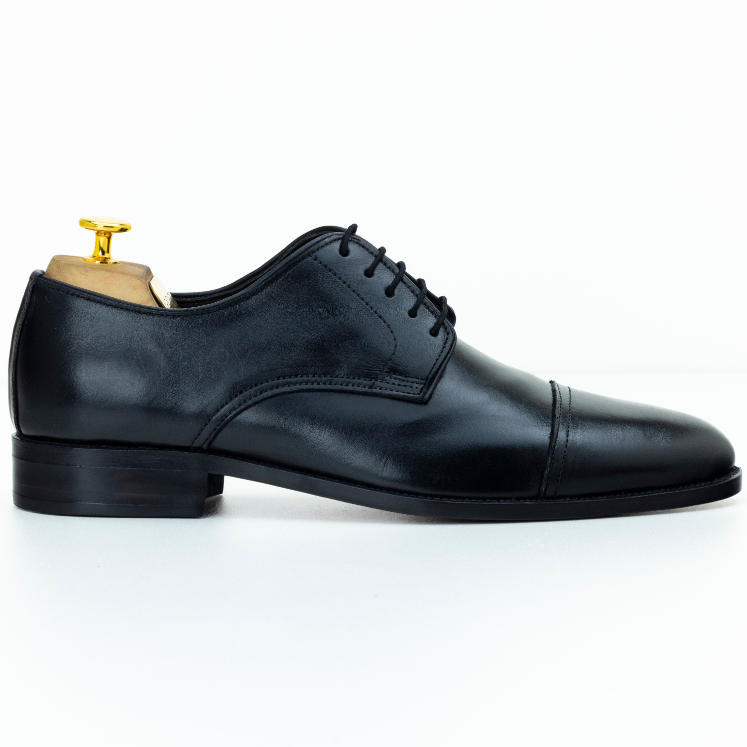 Discover The Silas Formal Black Shoes, handcrafted from 100% full-grain calf leather sourced from Italy, featuring a sleek black straight cap Derby design with a medium almond toe. With a lace-up style, full leather Goodyear welted sole, and leather-and-wood stacked heel, this handmade masterpiece offers refined style and lasting comfort that captivates. Perfect for suits or chinos, its sophisticated allure is impossible to resist.
