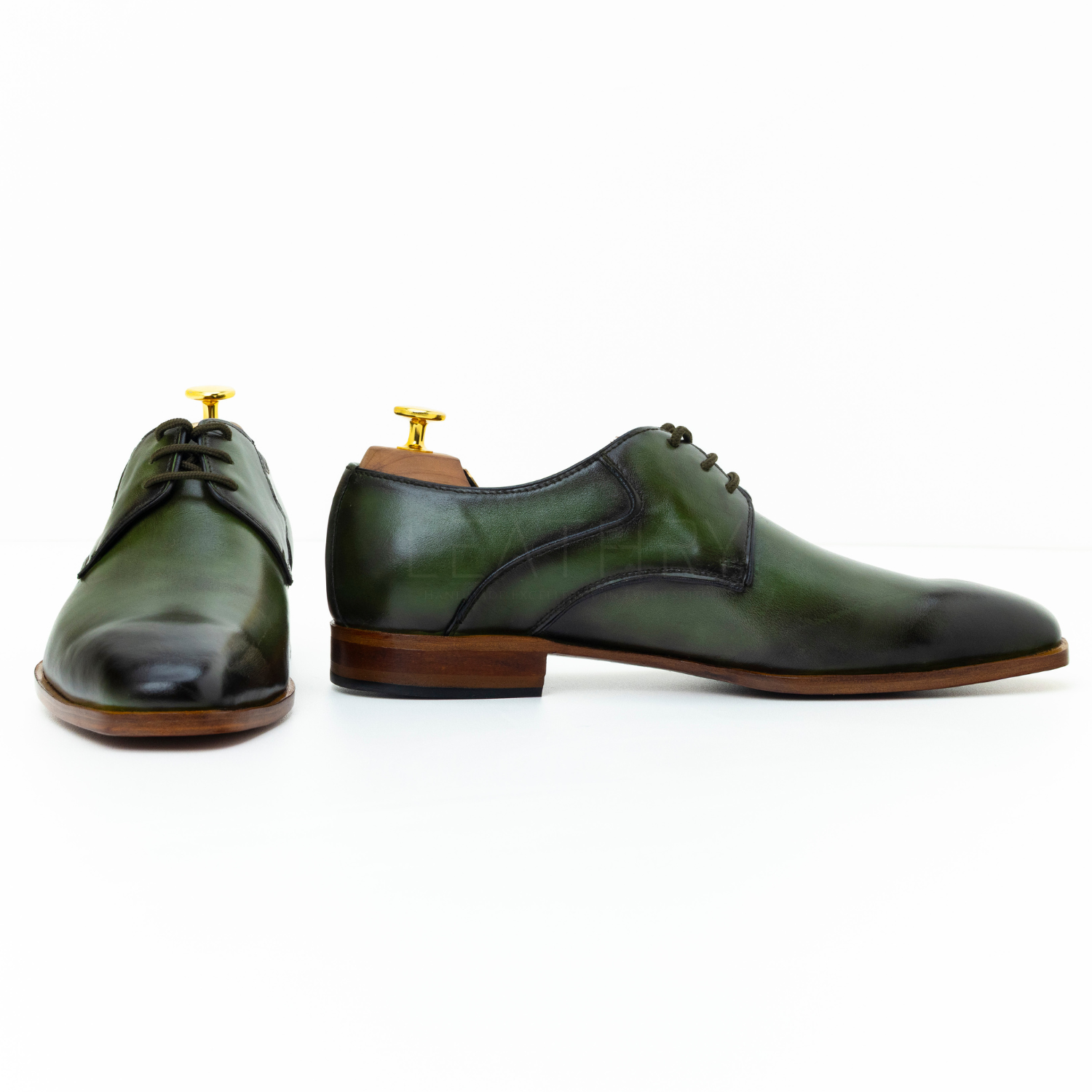 The Yardin | Green Doubly Dye Patina is a handcrafted Derby shoe with a hand-painted green antiqued Italian calf leather upper. Featuring a durable Goodyear welted natural calf leather sole, leather-wrapped laces, and a comfortable calf leather lining, these almond-toe, three-eyelet Derbys blend bold artistry with lasting comfort, perfect for formal and casual settings.